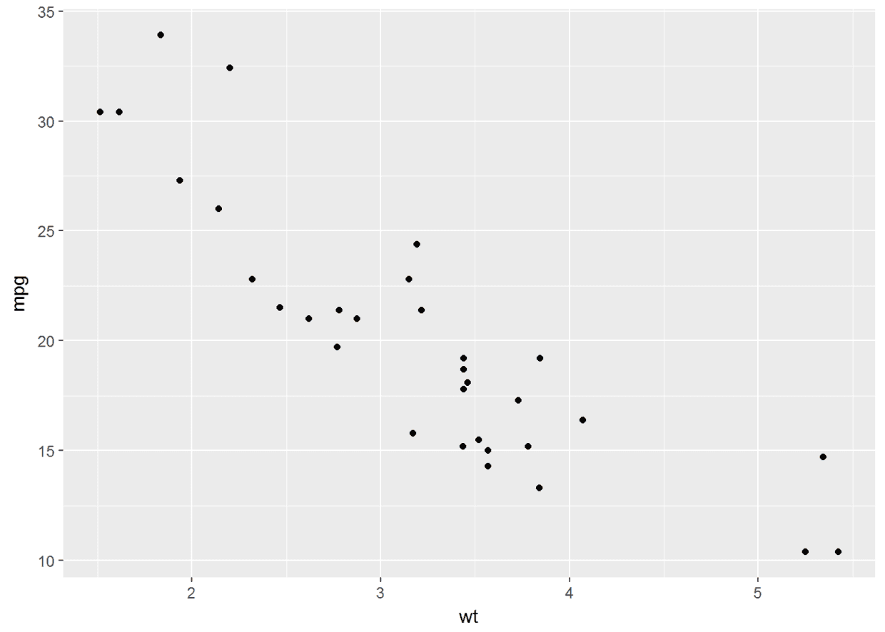 ggplot(data=mtcars, aes(x=wt, y=mpg)) + geom_point()