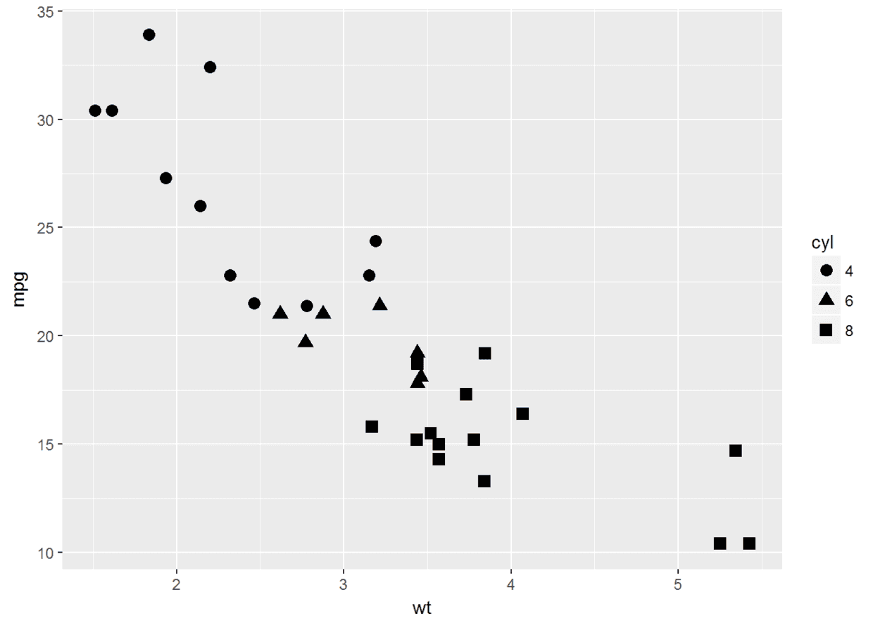 ggplot(data=mtcars, aes(x=wt, y=mpg, shape=cyl))+geom_point(size=3)