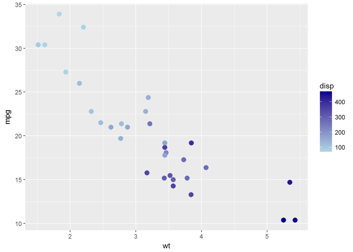 ggplot(data=mtcars, aes(x=wt, y=mpg, color=disp))+geom_point(size=3)
