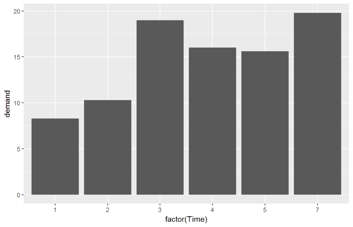 ggplot(data=BOD, aes(x=Time, y=demand))+ geom_bar(stat = "identity")#此时Time是数值型
