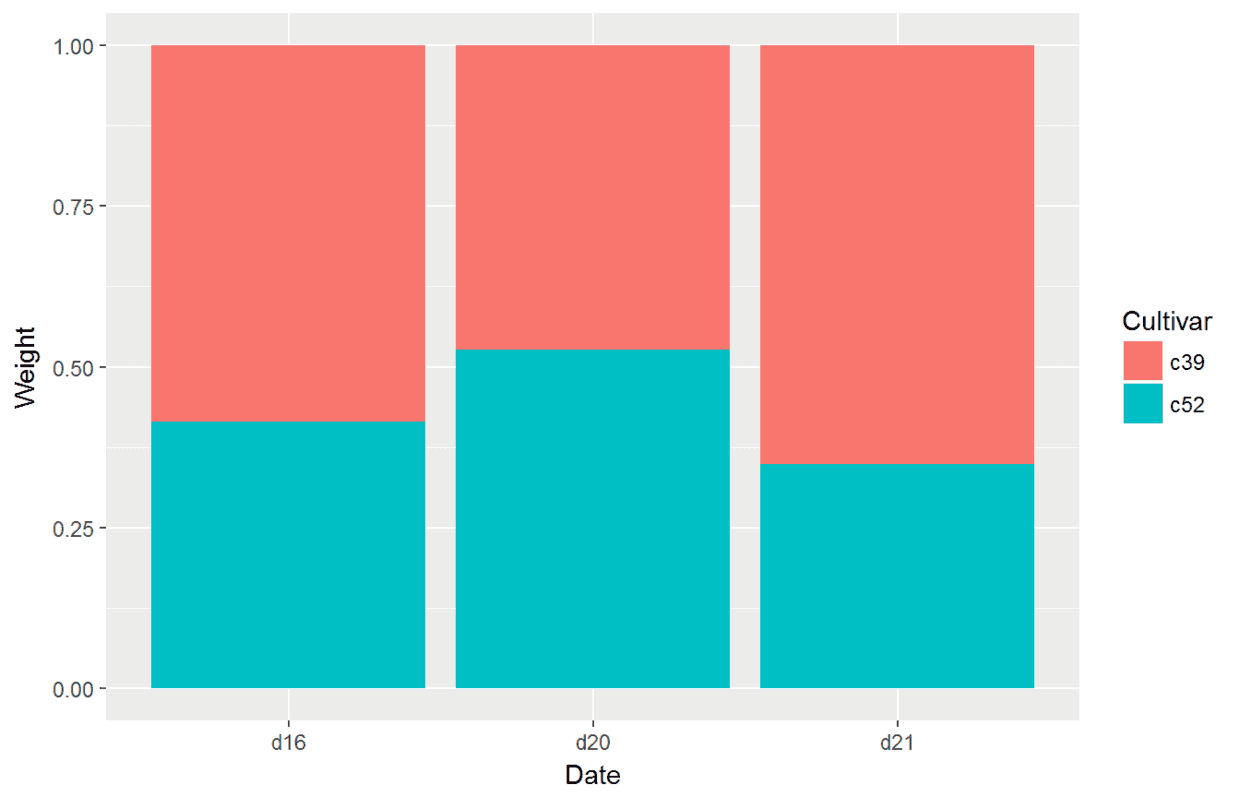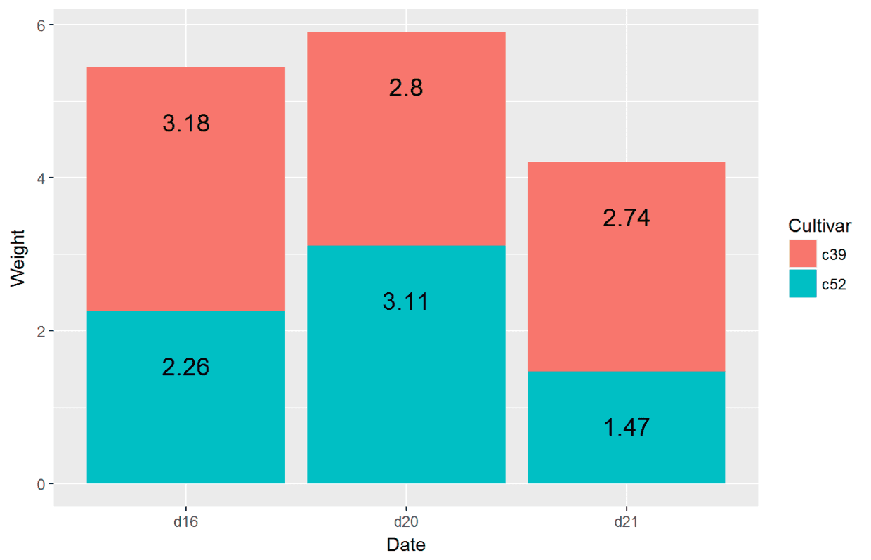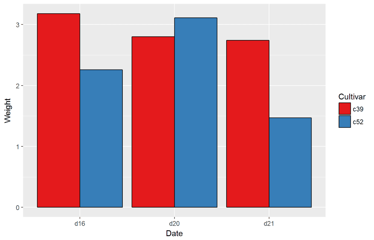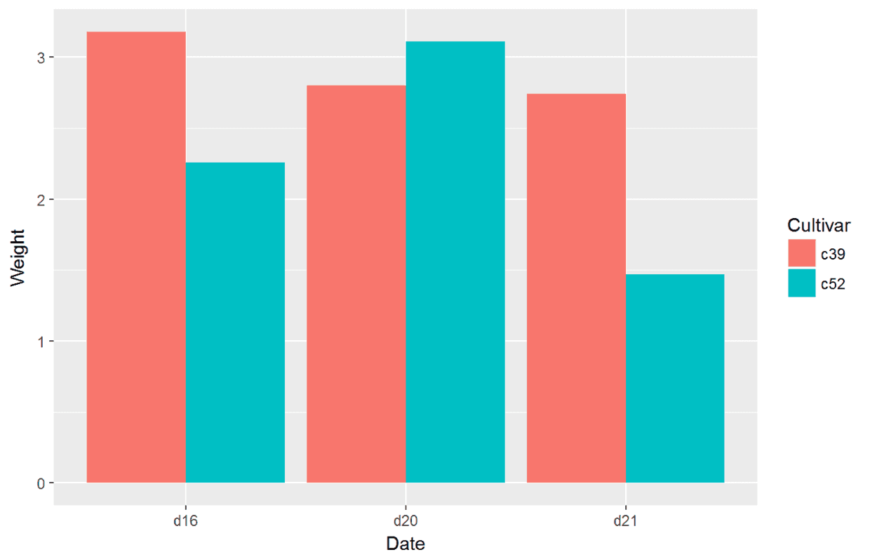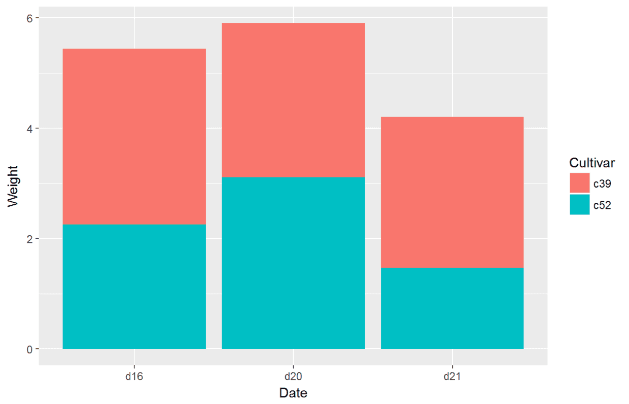 ggplot(data=cabbage_exp, aes(x=Date, y=Weight, fill=Cultivar))+#分别将Date与Cultivar映射给x和fill