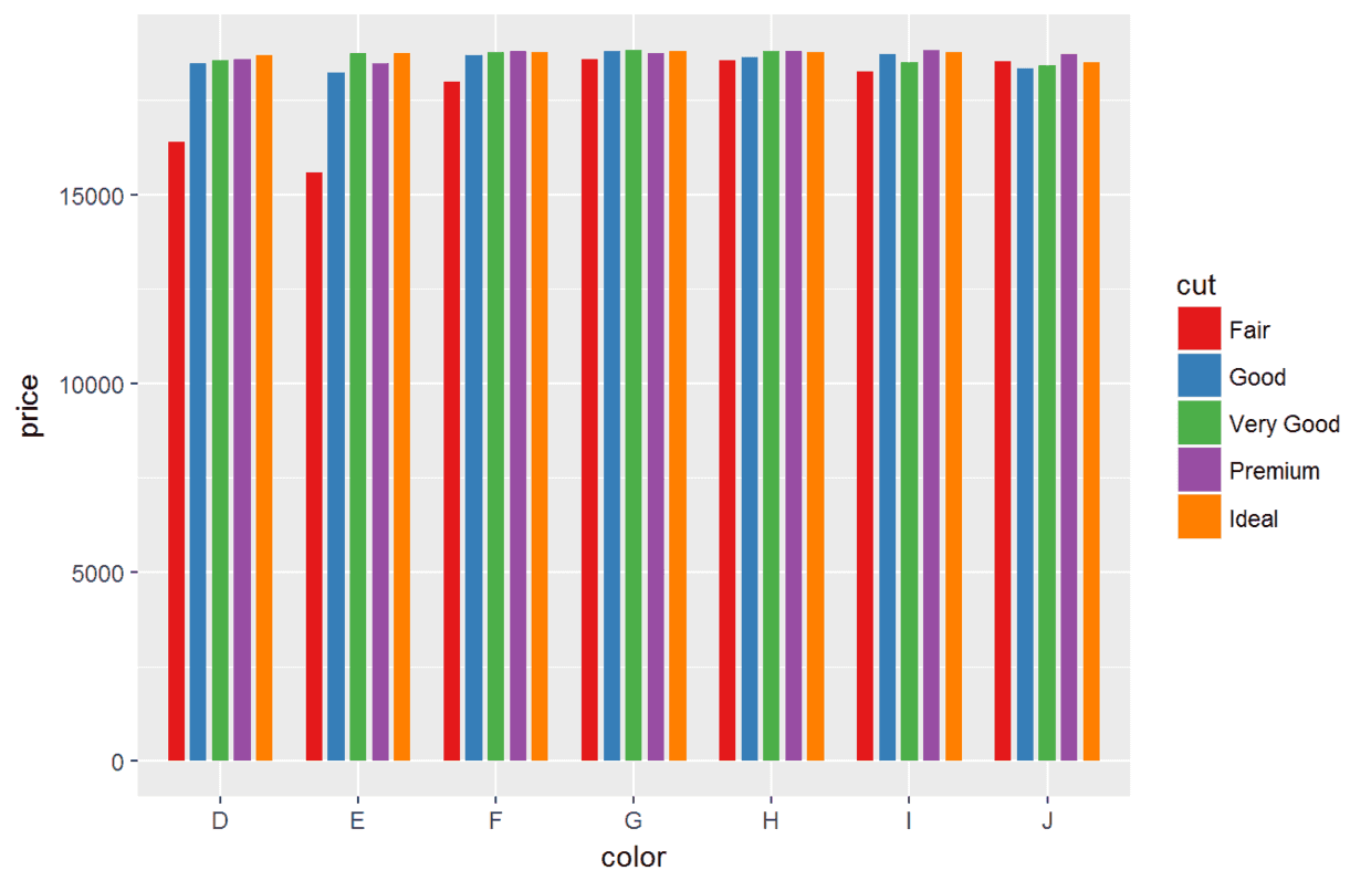 ggplot(data=diamonds, aes(x=color, y=price, fill=cut))+