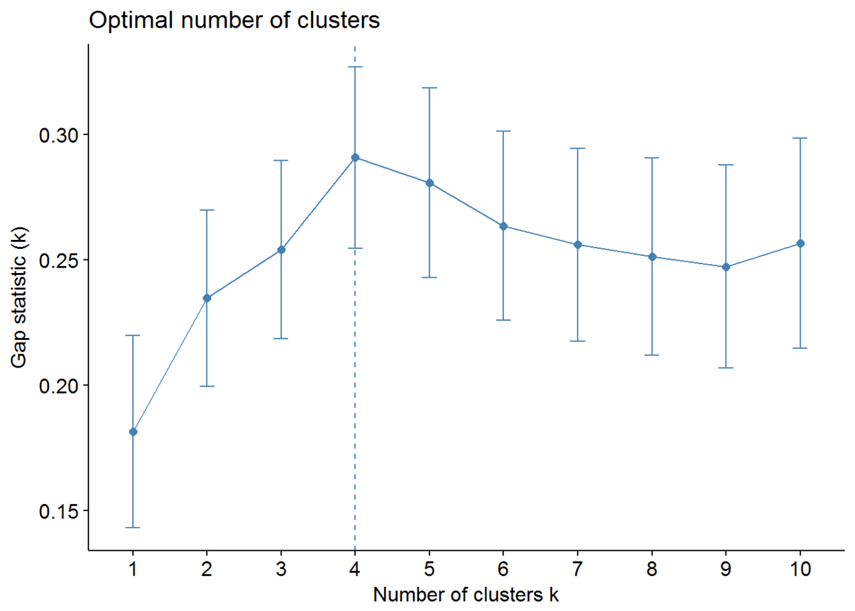 由于k均值聚类需要指定要生成的聚类数量,因此我们将使用函数clusGap()来计算用于估计最优聚类数。函数fviz_gap_stat()用于可视化。