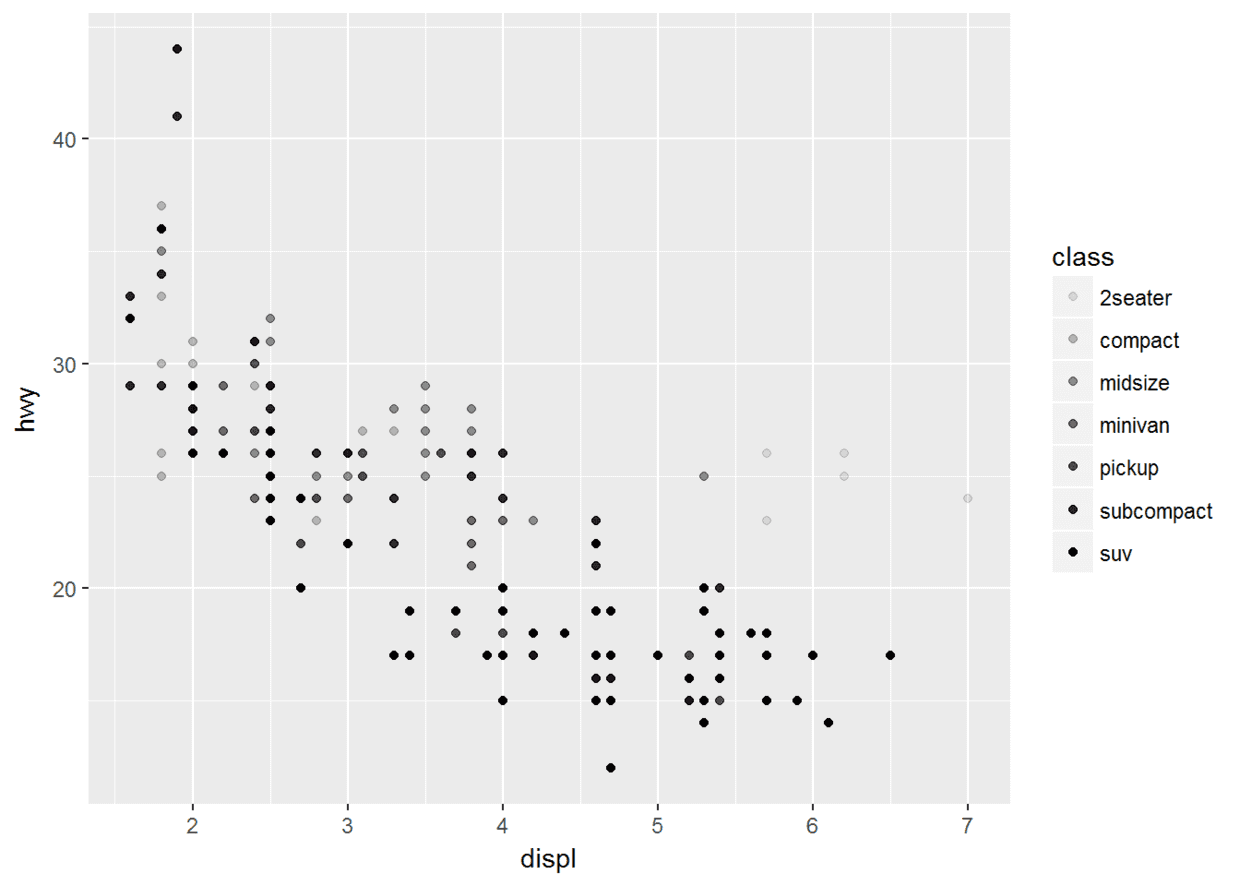 ggplot(mpg)+ geom_point(aes(x=displ, y=hwy, alpha=class))