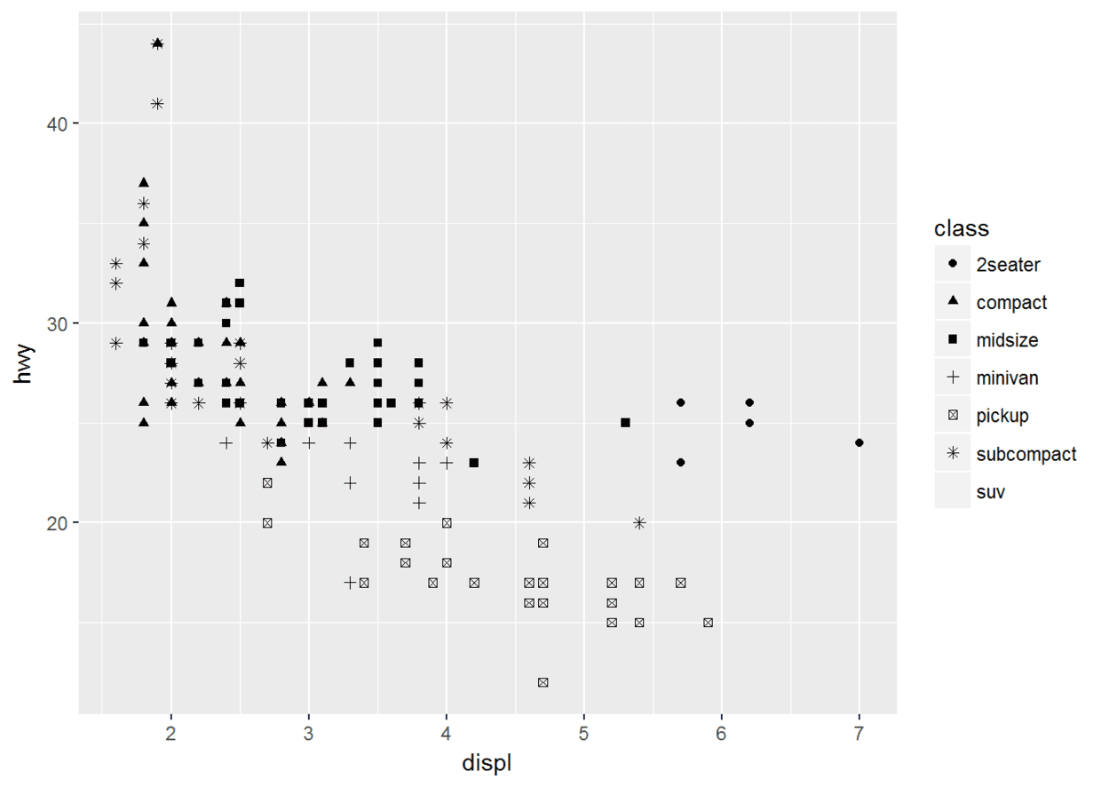 ggplot(mpg)+ geom_point(aes(x=displ, y=hwy, shape=class))